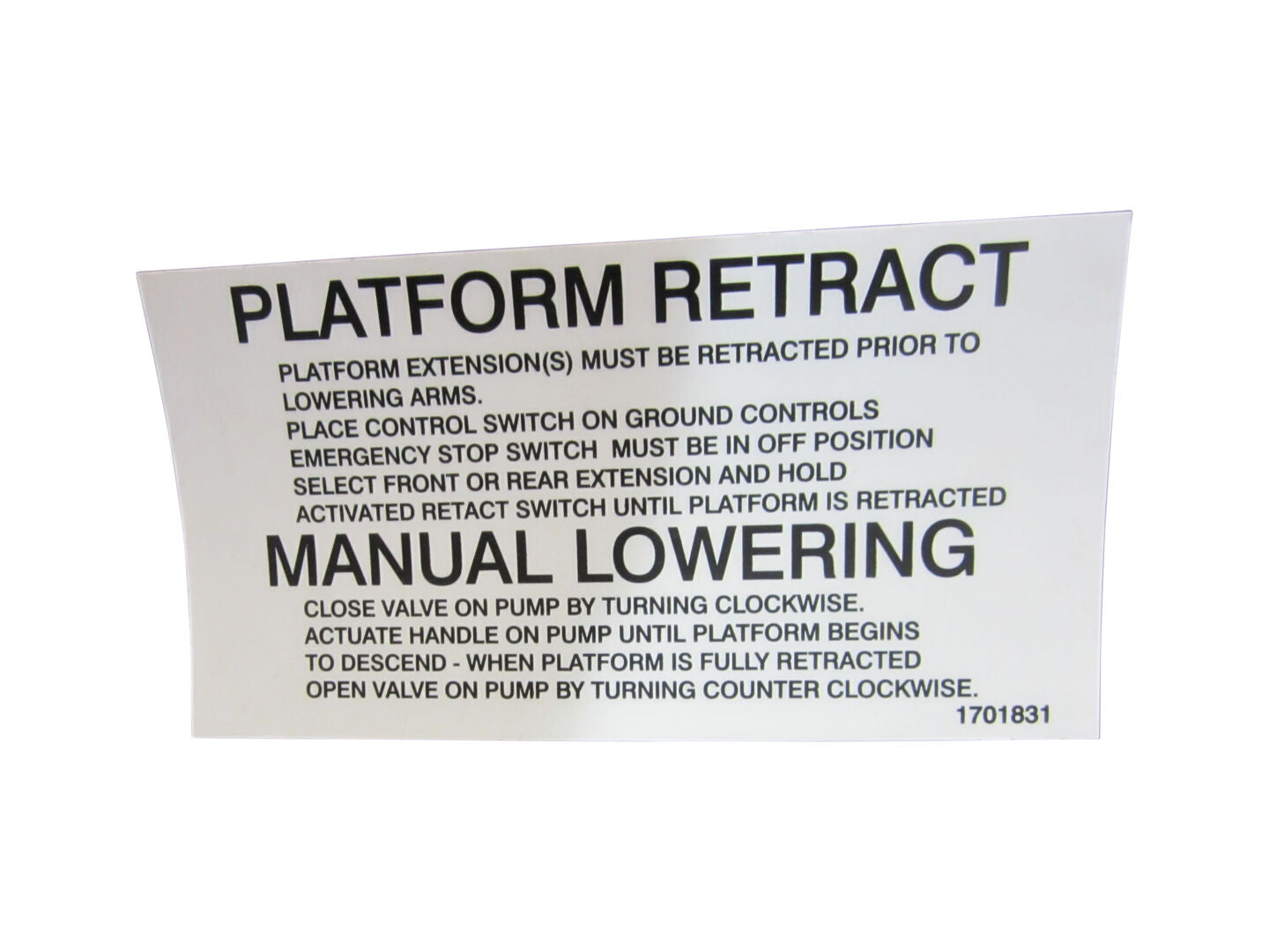The DECAL, (MAN LOWERING) (SKU 1701831) is for P consumables. It serves as a marking or identification element applied where specified by maintenance or operational needs.