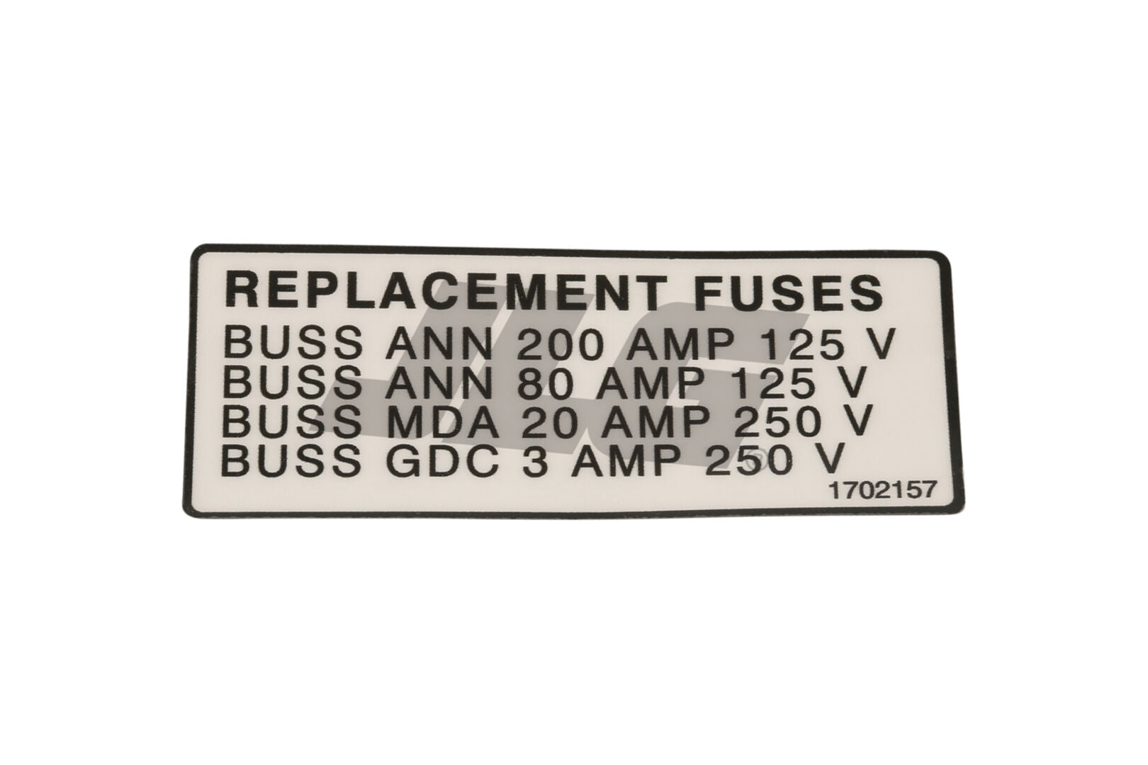 The DECAL, FUSE REPLACEMENT (SKU 1702157) is a consumable decal used to mark fuse replacement points. It assists in identifying fuse locations clearly during maintenance or repair tasks. This decal supports organized and safe consumable management.