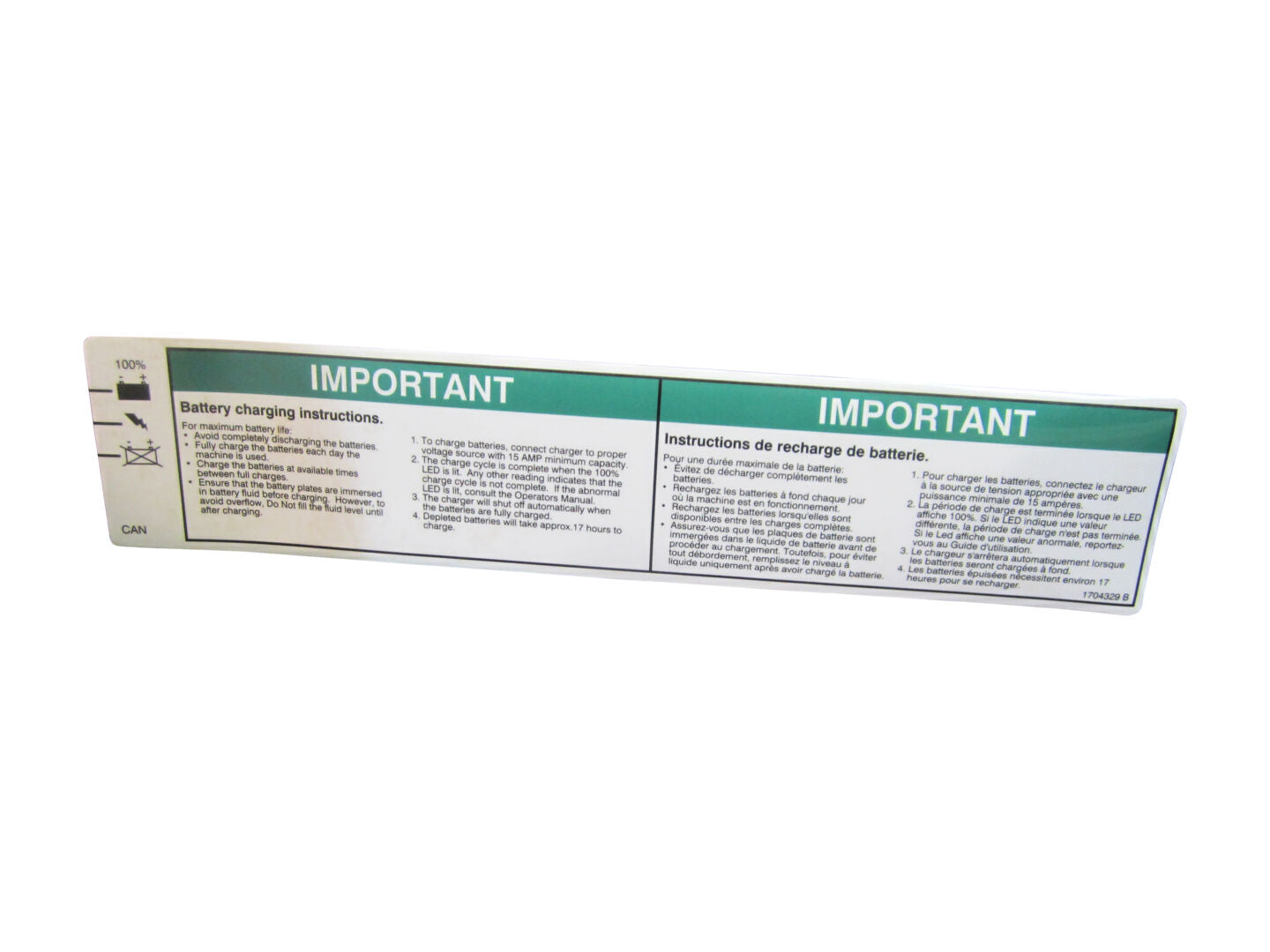The DECAL,BAT CHARGE INSTR (DOM2) (SKU 1704328) is a consumable decal used for marking battery charge instructions. It supports identification and guidance on equipment where clear labeling is required. No dimensions or weight data are provided.