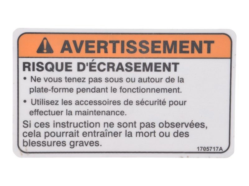 The DECAL, CRUSHING (CAN) (SKU 1705717) is for consumables used in labeling or marking applications. It provides clear identification where specified. This decal supports maintenance or operational needs in consumable supplies.