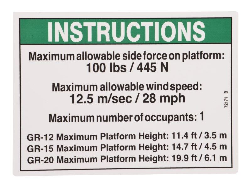 The SIDE FORCE 100 GR ANSI (SKU GN72171) is a decal for consumables related to steel medium precision machining. This vinyl decal displays the maximum side force allowed on a platform along with the maximum windspeed. It is important to verify the proper model and serial range before purchasing parts. Compatible with: GN72171GT, 72171, 72171GN, 72171GT, 72171GTGN