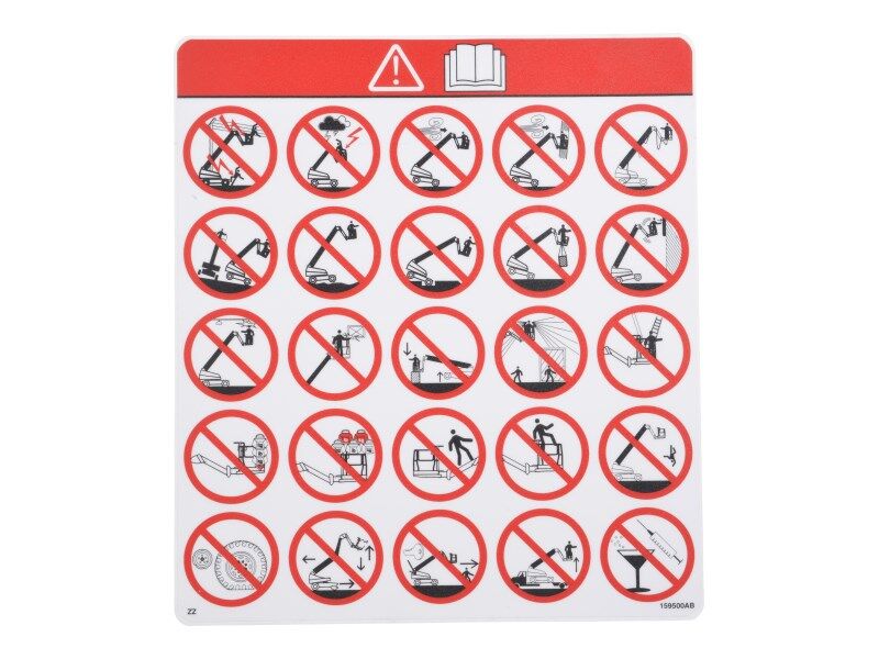 The LABEL VL WARNING HAZARDS PIC (SKU SJ159500) is for Skyjack consumables. It serves as a safety decal to communicate hazard warnings visually on equipment. Use this label to maintain clear hazard identification according to safety guidelines.